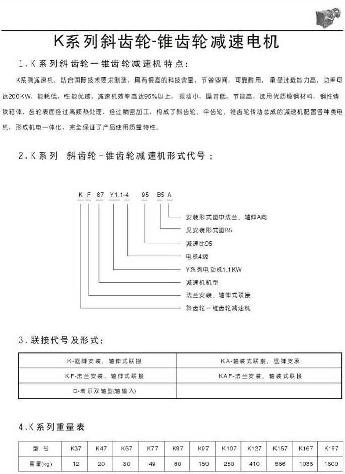 K系列斜齒輪-錐齒輪減速機特點型號表示法聯(lián)結代號及形式重量表